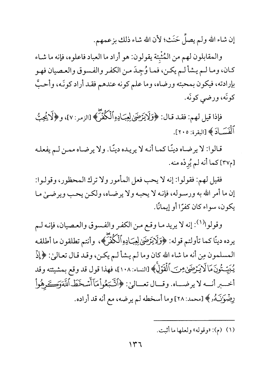 فقيل لهم: فقولوا: إنه لا يحب فعل المأمور ولا ترك المحظور، وقولوا: إن ما أمر الله به ورسوله، فإنه لا يحبه ولا يرضاه، ولكن يحب ويرضى ما يكون، سواء كان كفرًا أو إيمانًا.