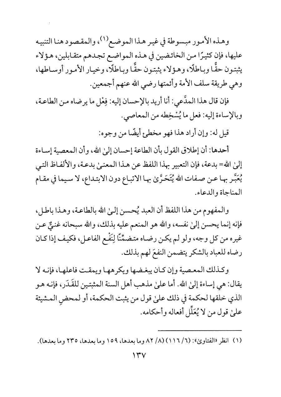 وكذلك المعصية وإن كان يبغضها ويكرهها ويمقت فاعلها، فإنه لا يقال: هي إساءة إلى الله. أما على مذهب أهل السنة المثبتين للقَدَر، فإنه هو الذي خلقها لحكمة في ذلك على قول من يثبت الحكمة، أو لمحضِ المشيئة على قول من لا يُعَلِّل أفعاله وأحكامه.