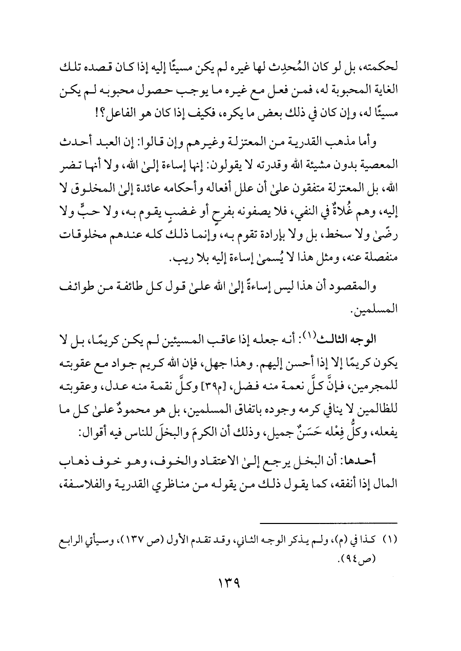 وأما مذهب القدرية من المعتزلة وغيرهم وإن قالوا: إن العبد أحدث المعصية بدون مشيئة الله وقدرته لا يقولون: إنها إساءة إلى الله، ولا أنها تضر الله، بل المعتزلة متفقون على أن علل أفعاله وأحكامه عائدة إلى المخلوق لا إليه، وهم غُلاةٌ في النفي، فلا يصفونه بفرحٍ أو غضبٍ يقوم به، ولا حبٍّ ولا رضًى ولا سخط، بل ولا بإرادة تقوم به، وإنما ذلك كله عندهم مخلوقات منفصلة عنه، ومثل هذا لا يُسمى إساءة إليه بلا ريب.