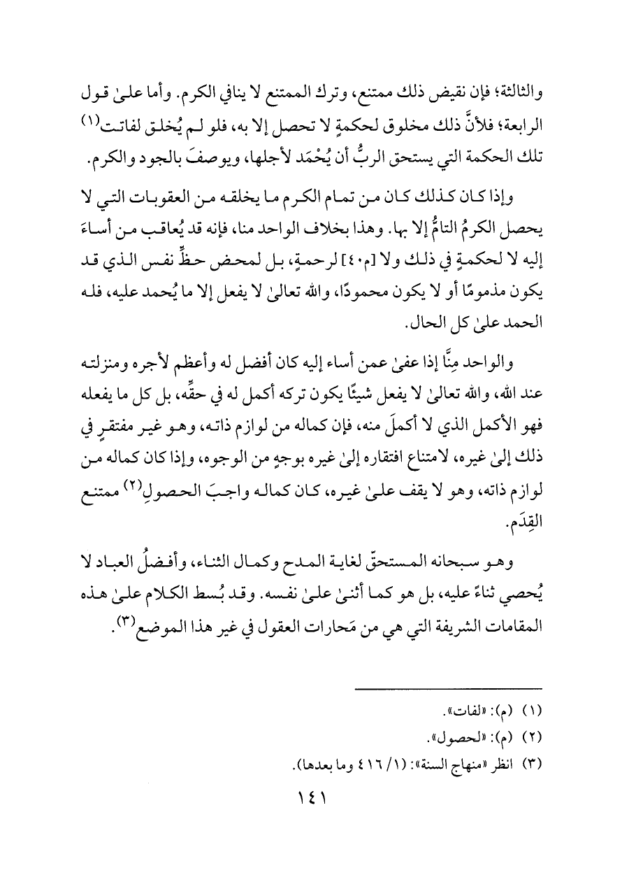 وإذا كان كذلك كان من تمام الكرم ما يخلقه من العقوبات التي لا يحصل الكرمُ التامُّ إلا بها. وهذا بخلاف الواحد منا، فإنه قد يُعاقب من أساءَ إليه لا لحكمةٍ في ذلك ولا [م ٤٠] لرحمةٍ، بل لمحض حظِّ نفس الذي قد يكون مذمومًا أو لا يكون محمودًا، والله تعالى لا يفعل إلا ما يُحمد عليه، فله الحمد على كل الحال.