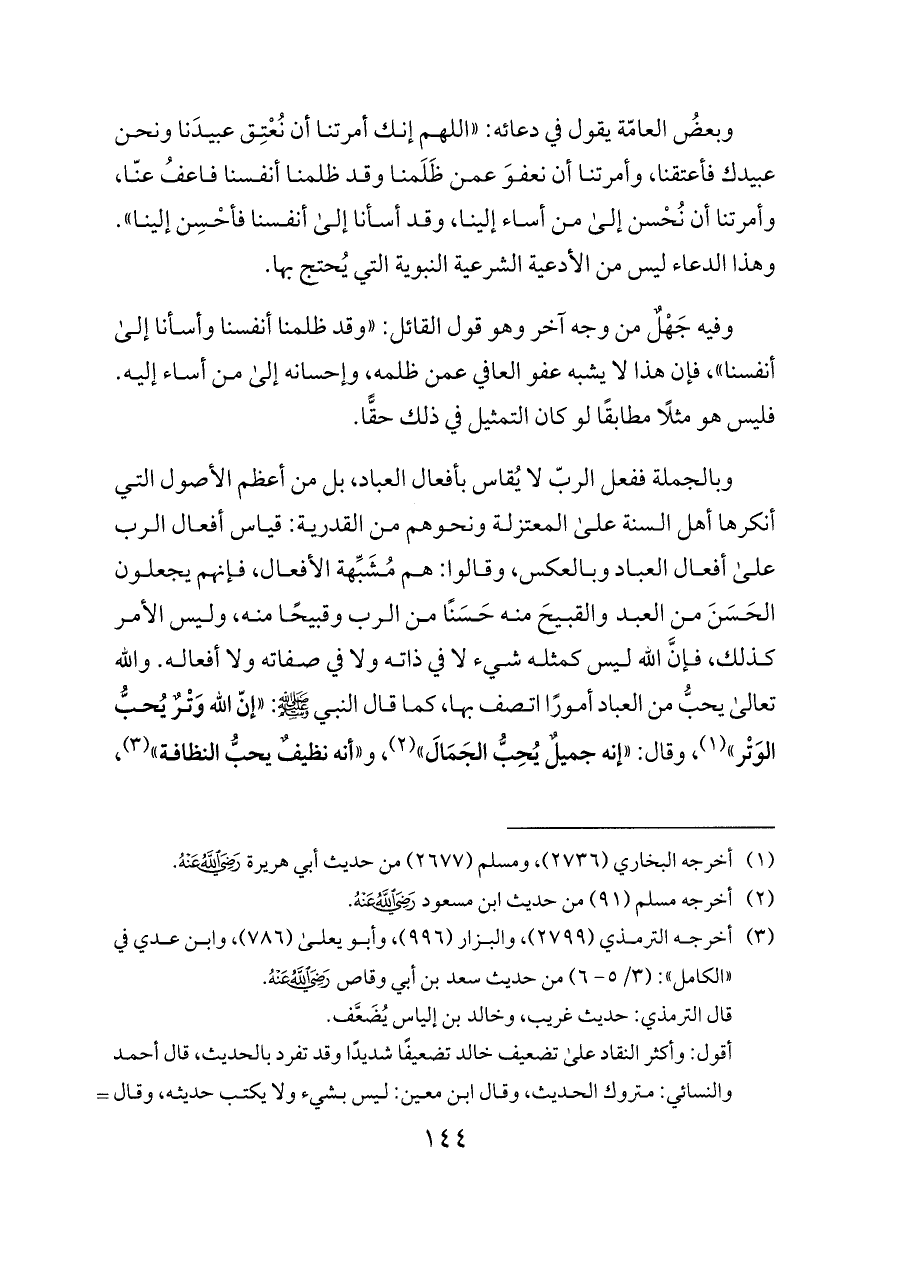 وبالجملة ففعل الربّ لا يُقاس بأفعال العباد، بل من أعظم الأصول التي أنكرها أهل السنة على المعتزلة ونحوهم من القدرية: قياس أفعال الرب على أفعال العباد وبالعكس، وقالوا: هم مُشَبِّهة الأفعال، فإنهم يجعلون الحَسَنَ من العبد والقبيحَ منه حَسَنًا من الرب وقبيحًا منه، وليس الأمر كذلك، فإنَّ الله ليس كمثله شيء لا في ذاته ولا في صفاته ولا أفعاله. والله تعالى يحبُّ من العباد أمورًا اتصف بها، كما قال النبي - صلى الله عليه وسلم -: «إنّ الله وَتْرٌ يُحبُّ الوَتْر» (¬١)، وقال: «إنه جميلٌ يُحِبُّ الجَمَالَ» (¬٢)، و «أنه نظيفٌ يحبُّ النظافة» (¬٣)،