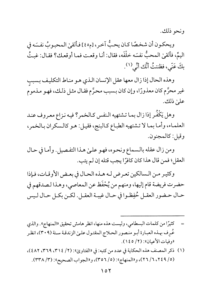 وهذه الحال إذا زال معها عقل الإنسان الذي هو مناط التكليف بسببٍ غير محرَّم كان معذورًا، وإن كان بسبب محرَّم فقال مثل ذلك، فهو مذموم على ذلك.
