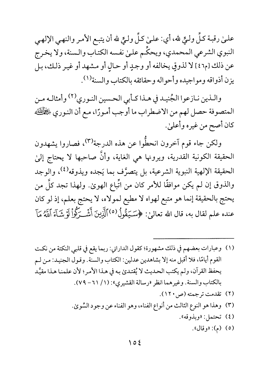 (¬١) وعبارات بعضهم في ذلك مشهورة؛ كقول الداراني: ربما يقع في قلبي النكتة من نكت القوم أيامًا، فلا أقبل منه إلا بشاهدين عدلين: الكتاب والسنة. وقول الجنيد: من لم يحفظ القرآن، ولم يكتب الحديث لا يُقتدى به في هذا الأمر؛ لأن علمنا هذا مقيَّد بالكتاب والسنة. وغيرهما انظر «رسالة القشيري»: (١/ ٦١ - ٧٩).