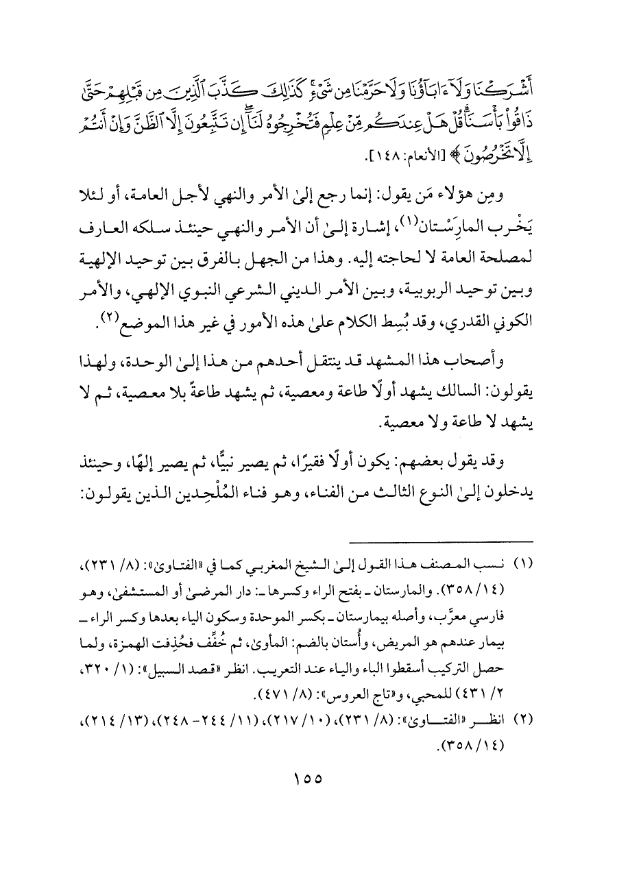 ومِن هؤلاء مَن يقول: إنما رجع إلى الأمر والنهي لأجل العامة، أو لئلا يَخْرب المارَِسْتان (¬١)، إشارة إلى أن الأمر والنهي حينئذ سلكه العارف لمصلحة العامة لا لحاجته إليه. وهذا من الجهل بالفرق بين توحيد الإلهية وبين توحيد الربوبية، وبين الأمر الديني الشرعي النبوي الإلهي، والأمر الكوني القدري، وقد بُسِط الكلام على هذه الأمور في غير هذا الموضع (¬٢).