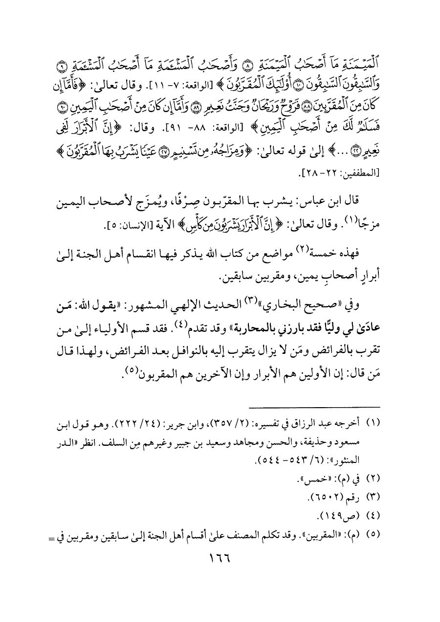 الْمَيْمَنَةِ مَا أَصْحَابُ الْمَيْمَنَةِ (٨) وَأَصْحَابُ الْمَشْأَمَةِ مَا أَصْحَابُ الْمَشْأَمَةِ (٩) وَالسَّابِقُونَ السَّابِقُونَ (١٠) أُولَئِكَ} [الواقعة: ٧ - ١١]. وقال تعالى: {فَأَمَّا إِنْ كَانَ مِنَ الْمُقَرَّبِينَ (٨٨) فَرَوْحٌ وَرَيْحَانٌ وَجَنَّتُ نَعِيمٍ (٨٩) وَأَمَّا إِنْ كَانَ مِنْ أَصْحَابِ الْيَمِينِ (٩٠) فَسَلَامٌ لَكَ مِنْ أَصْحَابِ الْيَمِينِ} [الواقعة: ٨٨ - ٩١]. وقال: {إِنَّ الْأَبْرَارَ لَفِي نَعِيمٍ (٢٢) ... } إلى قوله تعالى: {وَمِزَاجُهُ مِنْ تَسْنِيمٍ (٢٧) عَيْنًا يَشْرَبُ بِهَا الْمُقَرَّبُونَ} [المطففين: ٢٢ - ٢٨].