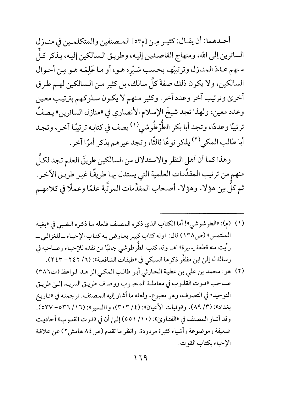 أحدهما: أن يقال: كثير مِن [م ٥٣] المصنفين والمتكلمين في منازل السائرين إلى الله، ومنهاج القاصدين إليه، وطريق السالكين إليه، يذكر كلٌّ منهم عددَ المنازل وترتيبَها بحسب سَيْرِه هو، أو ما عَلِمَه هو مِن أحوال السالكين، ولا يكون ذلك صفةَ كلِّ سالك، بل كثير من السالكين لهم طرق أخرى وترتيب آخر وعدد آخر. وكثير منهم لا يكون سلوكهم بترتيب معين وعدد معين، ولهذا تجد شيخَ الإسلام الأنصاري في «منازل السائرين» يصفُ ترتيبًا وعددًا، وتجد أبا بكر الطُّرْطُوشي (¬١) يصف في كتابه ترتيبًا آخر، وتجد أبا طالب المكي (¬٢) يذكر نوعًا ثالثًا، وتجد غيرهم يذكر أمرًا آخر.