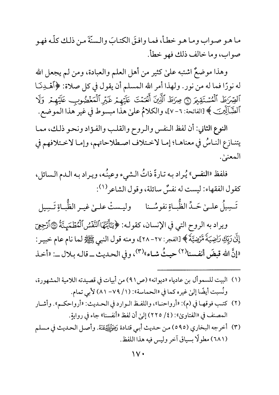النوع الثاني: أن لفظ النفس والروح والقلب والفؤاد ونحو ذلك، مما يتنازع الناسُ في معناها؛ إما لاختلاف اصطلاحاتهم، وإما لاختلافهم في المعنى.