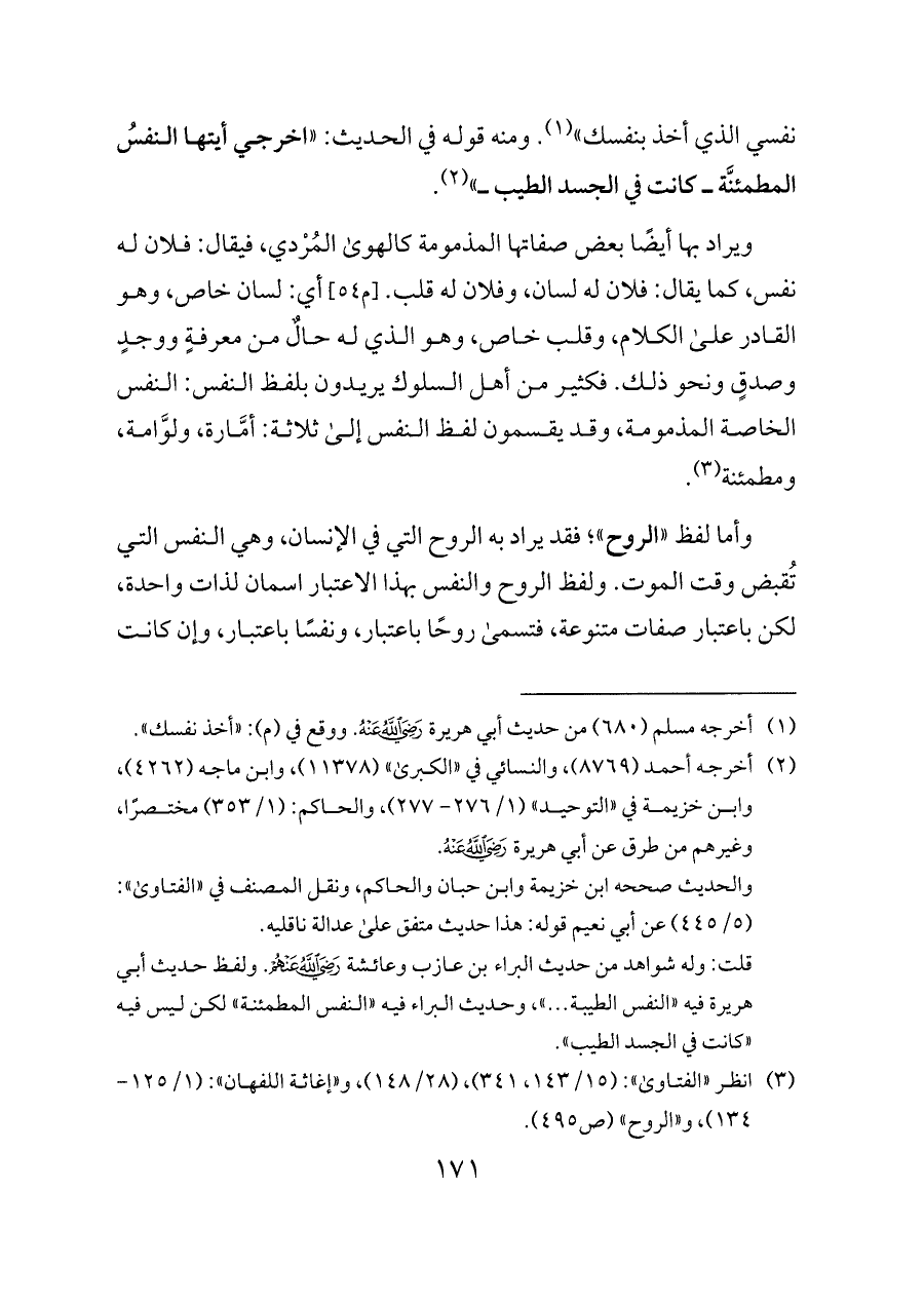 ويراد بها أيضًا بعض صفاتها المذمومة كالهوى المُرْدي، فيقال: فلان له نفس، كما يقال: فلان له لسان، وفلان له قلب. [م ٥٤] أي: لسان خاص، وهو القادر على الكلام، وقلب خاص، وهو الذي له حالٌ من معرفةٍ ووجدٍ وصدقٍ ونحو ذلك. فكثير من أهل السلوك يريدون بلفظ النفس: النفس الخاصة المذمومة، وقد يقسمون لفظ النفس إلى ثلاثة: أمَّارة، ولوَّامة، ومطمئنة (¬٣).