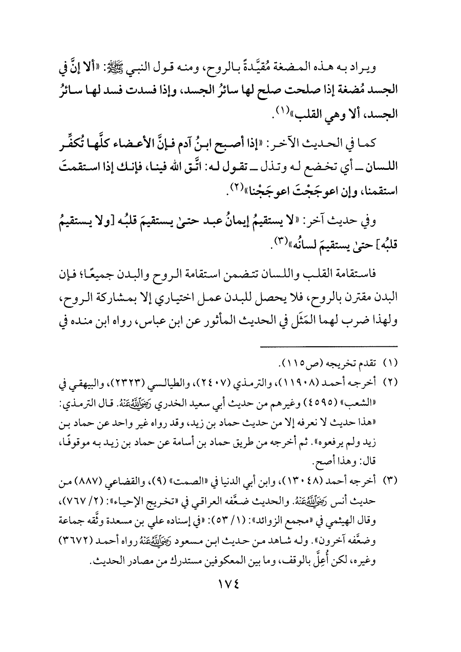 فاستقامة القلب واللسان تتضمن استقامة الروح والبدن جميعًا؛ فإن البدن مقترن بالروح، فلا يحصل للبدن عمل اختياري إلا بمشاركة الروح، ولهذا ضرب لهما المَثَل في الحديث المأثور عن ابن عباس، رواه ابن منده في