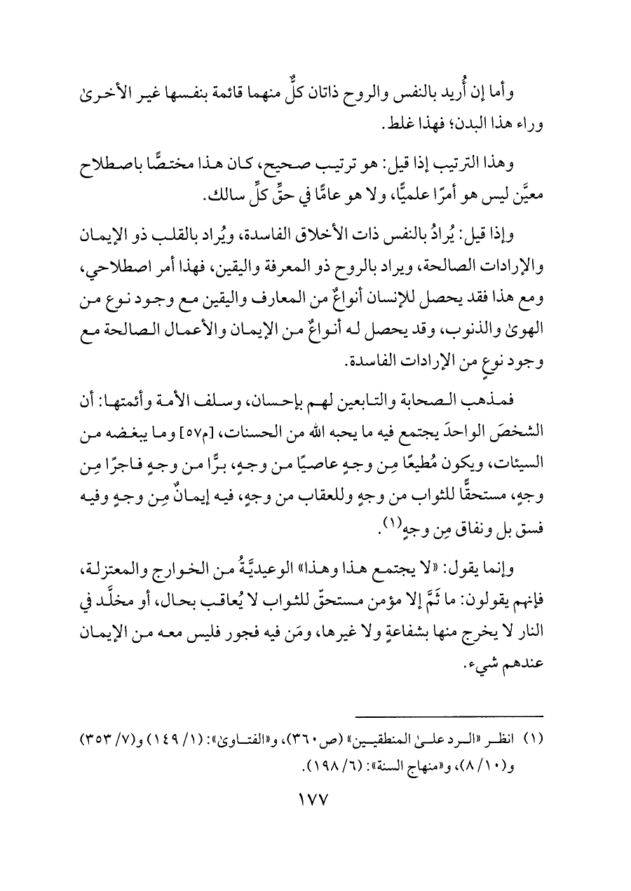 فمذهب الصحابة والتابعين لهم بإحسان، وسلف الأمة وأئمتها: أن الشخصَ الواحدَ يجتمع فيه ما يحبه الله من الحسنات، [م ٥٧] وما يبغضه من السيئات، ويكون مُطيعًا مِن وجهٍ عاصيًا من وجهٍ، برًّا من وجهٍ فاجرًا مِن وجهٍ، مستحقًّا للثواب من وجهٍ وللعقاب من وجهٍ، فيه إيمانٌ مِن وجهٍ وفيه فسق بل ونفاق مِن وجهٍ (¬١).