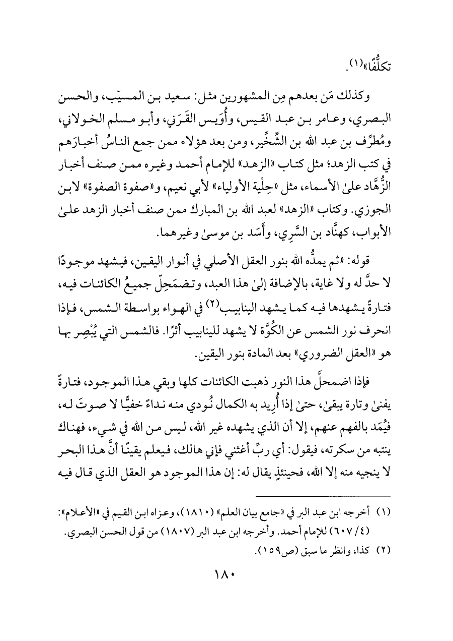 قوله: «ثم يمدُّه الله بنور العقل الأصلي في أنوار اليقين، فيشهد موجودًا لا حدَّ له ولا غاية، بالإضافة إلى هذا العبد، وتضمَحِلّ جميعُ الكائنات فيه، فتارةً يشهدها فيه كما يشهد الينابيب (¬٢) في الهواء بواسطة الشمس، فإذا انحرف نور الشمس عن الكُوَّة لا يشهد للينابيب أثرًا. فالشمس التي يُبْصِر بها هو «العقل الضروري» بعد المادة بنور اليقين.