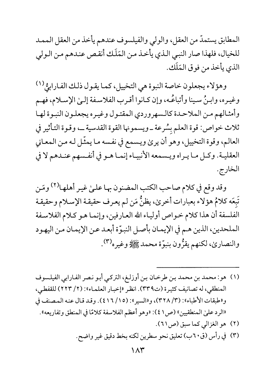 وقد وقع في كلام صاحب الكتب المضنون بها على غير أهلها (¬٢) ومَن تَبِعَه كلامُ هؤلاء بعبارات أخرى، يظنُّ مَن لم يعرف حقيقة الإسلام وحقيقة الفلسفة أن هذا كلام خواص أولياء الله العارفين، وإنما هو كلام الفلاسفة الملحدين، الذين هم في الإيمان بأصل النبوّة أبعد عن الإيمان من اليهود والنصارى، لكنهم يقرُّون بنبوّة محمد - صلى الله عليه وسلم - وغيره (¬٣).