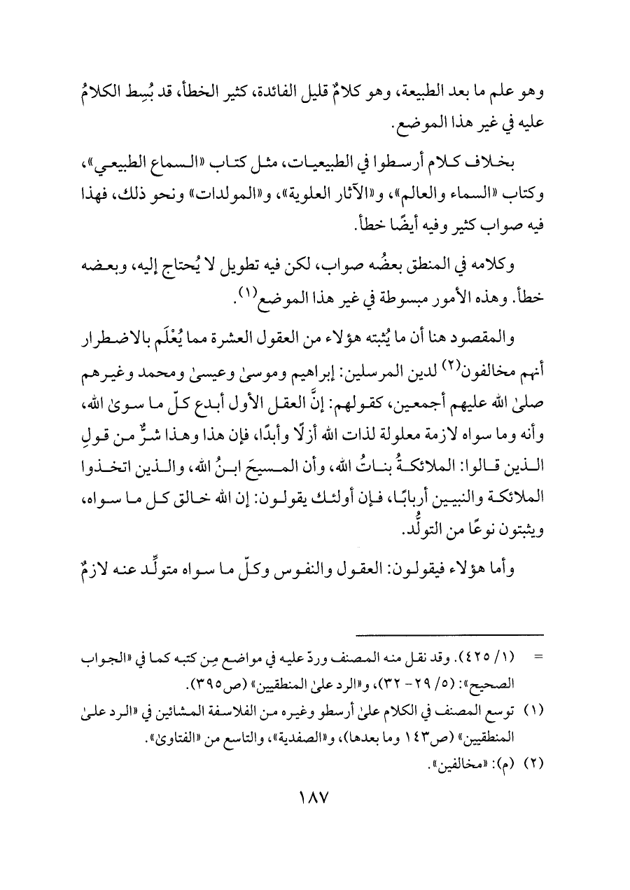 بخلاف كلام أرسطوا في الطبيعيات، مثل كتاب «السماع الطبيعي»، وكتاب «السماء والعالم»، و «الآثار العلوية»، و «المولدات» ونحو ذلك، فهذا فيه صواب كثير وفيه أيضًا خطأ.