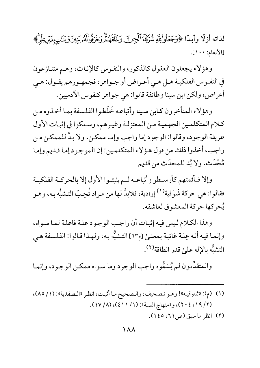 وهذا الكلام ليس فيه إثبات أن واجب الوجود علة فاعلة لما سواه، وإنما فيه أنه عِلة غائية بمعنى [م ٦٣] التشبُّه به، ولهذا قالوا: الفلسفة هي التشبُّه بالإله على قدر الطاقة (¬٢).
