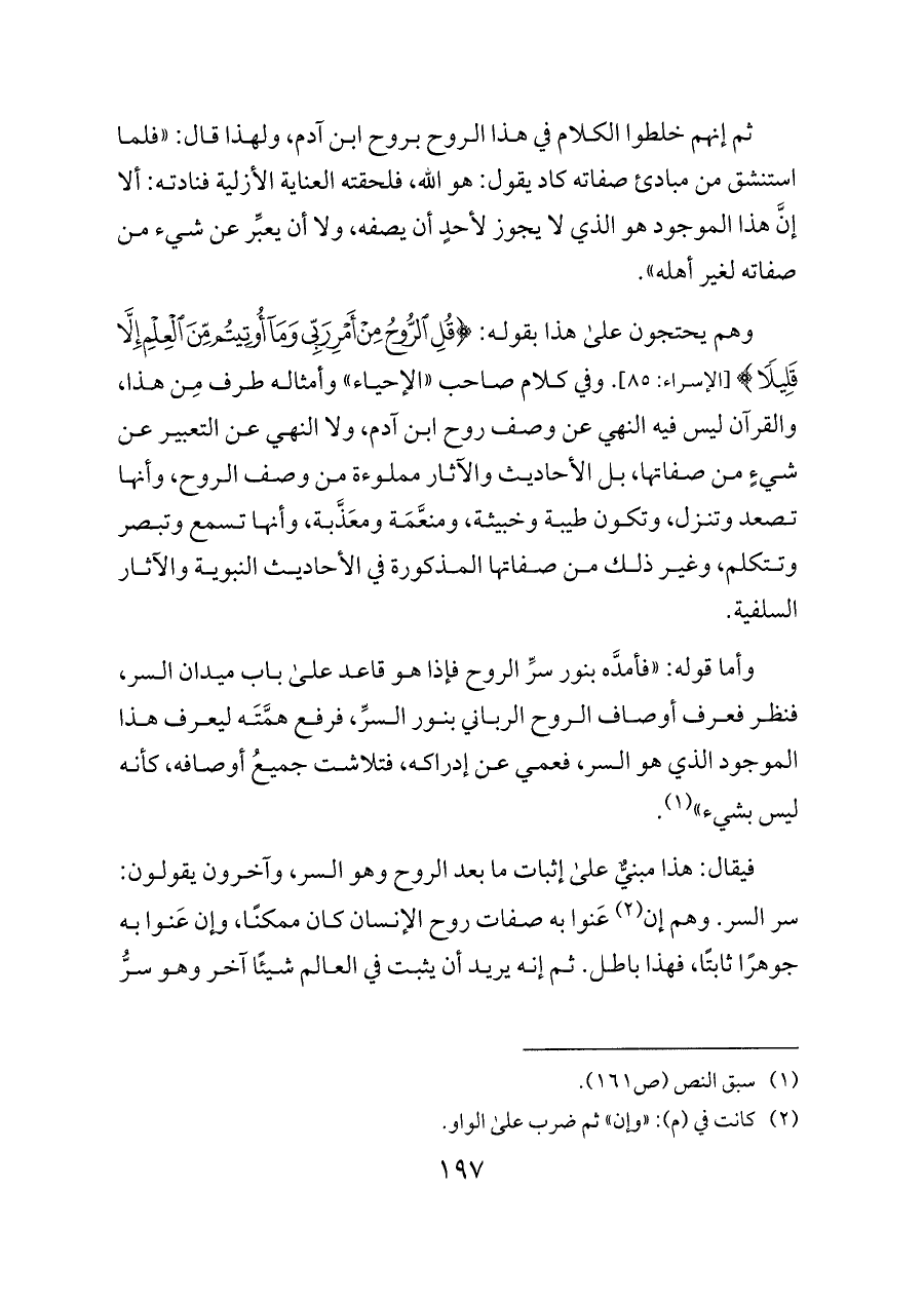 وهم يحتجون على هذا بقوله: {الرُّوحِ قُلِ الرُّوحُ مِنْ أَمْرِ رَبِّي وَمَا أُوتِيتُمْ مِنَ الْعِلْمِ} [الإسراء: ٨٥]. وفي كلام صاحب «الإحياء» وأمثاله طرف مِن هذا، والقرآن ليس فيه النهي عن وصف روح ابن آدم، ولا النهي عن التعبير عن شيءٍ من صفاتها، بل الأحاديث والآثار مملوءة من وصف الروح، وأنها تصعد وتنزل، وتكون طيبة وخبيثة، ومنعَّمَة ومعَذَّبة، وأنها تسمع وتبصر وتتكلم، وغير ذلك من صفاتها المذكورة في الأحاديث النبوية والآثار السلفية.