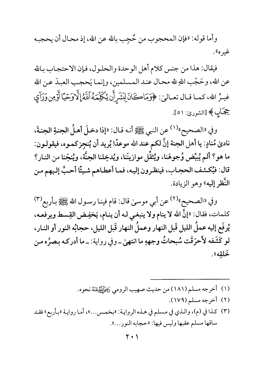 فيقال: هذا من جنس كلام أهل الوحدة والحلول، فإن الاحتجاب بالله عن الله، وحَجْب اللهِ لله محال عند المسلمين، وإنما يَحجب العبدَ عن الله غيرُ الله، كما قال تعالى: {وَمَا كَانَ لِبَشَرٍ أَنْ يُكَلِّمَهُ اللَّهُ إِلَّا وَحْيًا أَوْ مِنْ وَرَاءِ حِجَابٍ} [الشورى: ٥١].