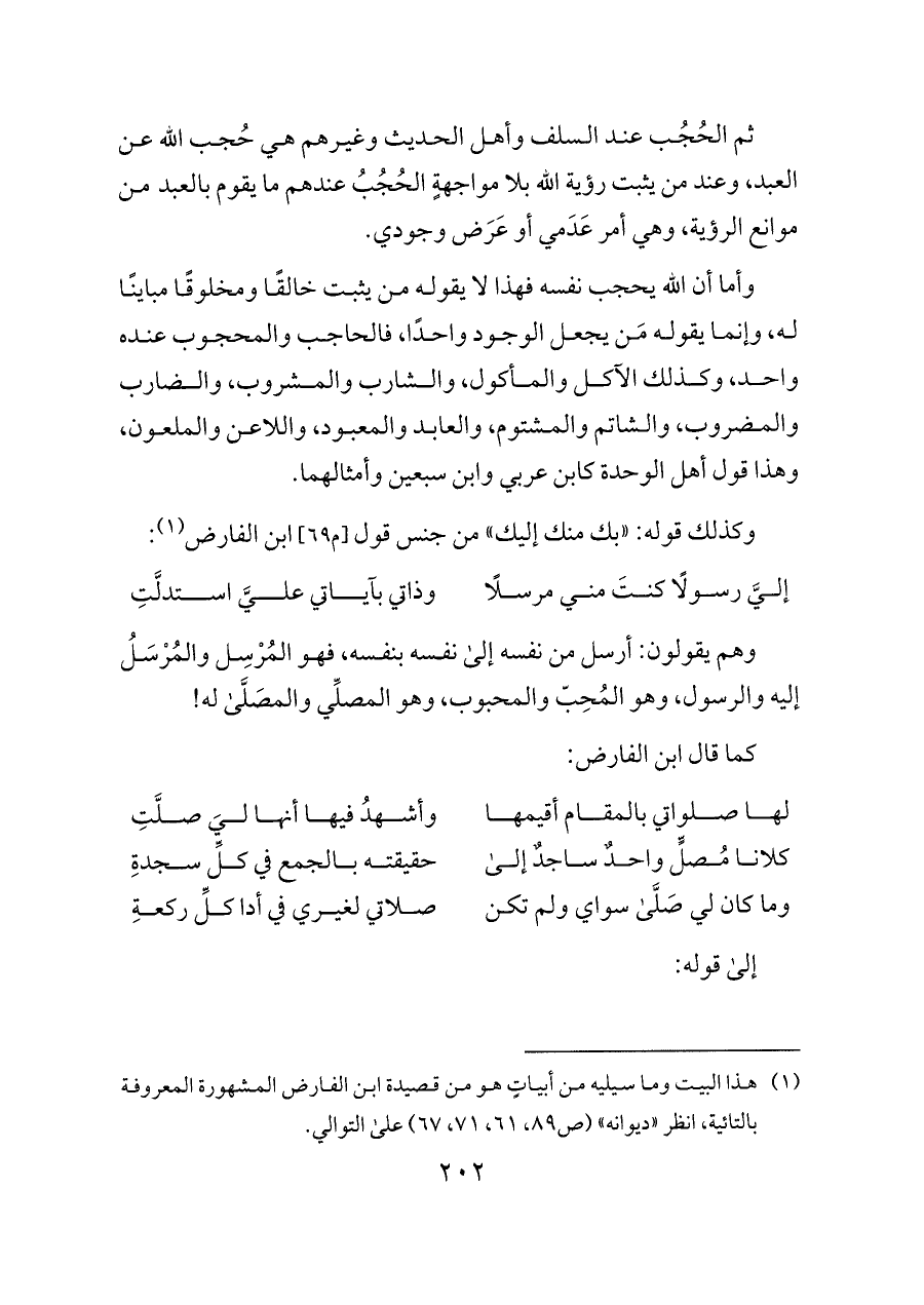 (¬١) هذا البيت وما سيليه من أبياتٍ هو من قصيدة ابن الفارض المشهورة المعروفة بالتائية، انظر «ديوانه» (ص ٨٩، ٦١، ٧١، ٦٧) على التوالي.