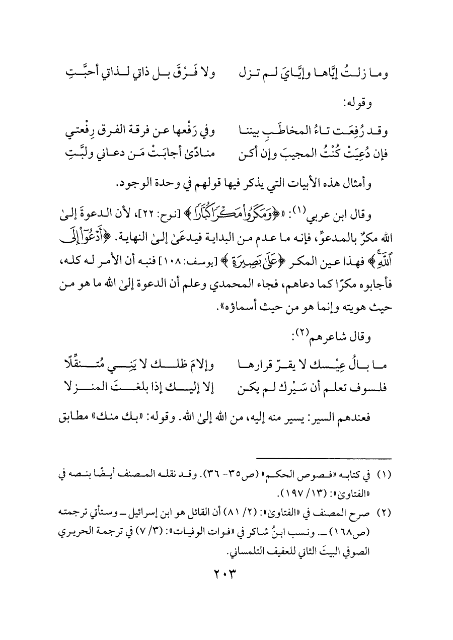 (¬٢) صرح المصنف في «الفتاوى»: (٢/ ٨١) أن القائل هو ابن إسرائيل ــ وستأتي ترجمته (ص ١٦٨) ــ. ونسب ابنُ شاكر في «فوات الوفيات»: (٣/ ٧) في ترجمة الحريري الصوفي البيتَ الثاني للعفيف التلمساني.
