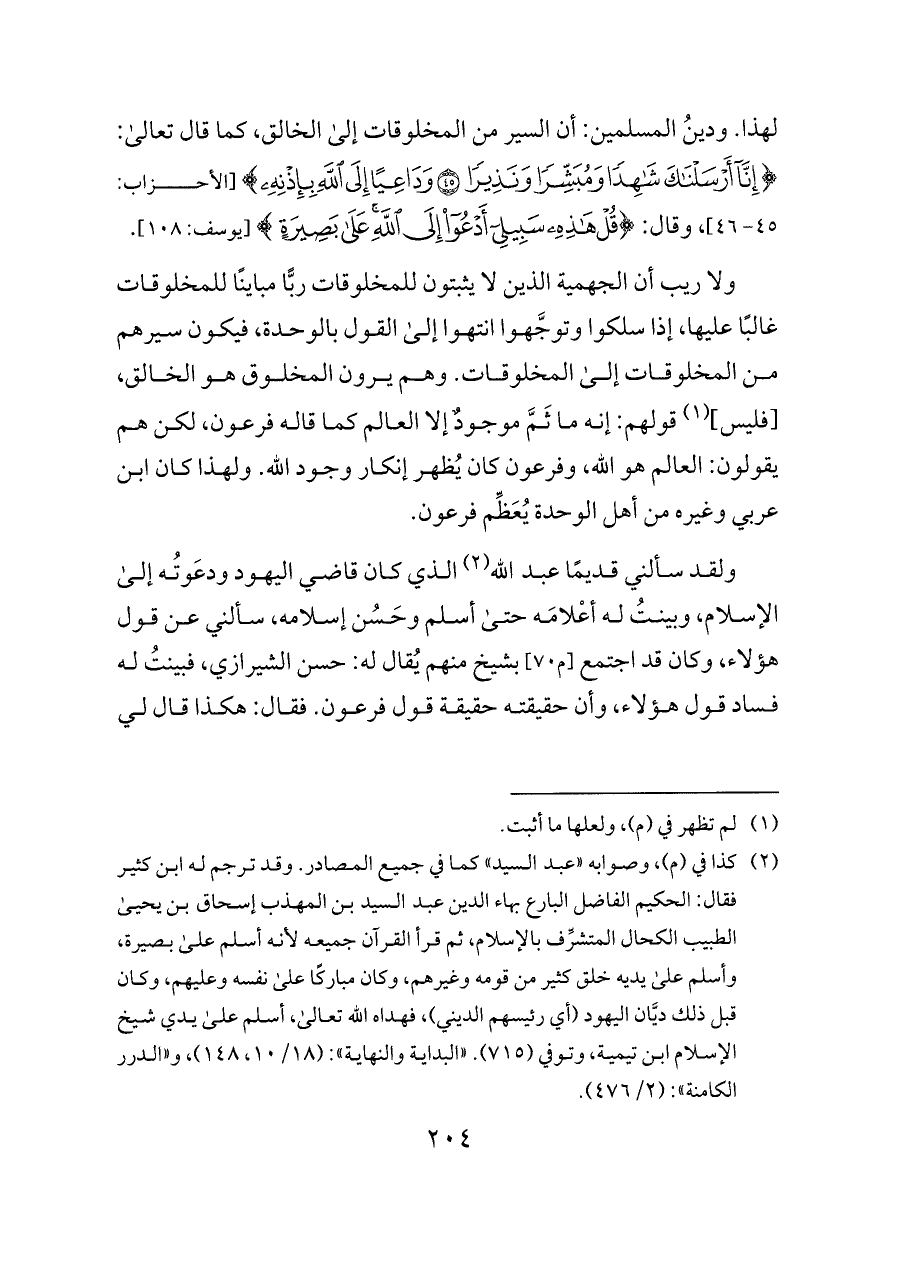 ولقد سألني قديمًا عبد الله (¬٢) الذي كان قاضي اليهود ودعَوتُه إلى الإسلام، وبينتُ له أعْلامَه حتى أسلم وحَسُن إسلامه، سألني عن قول هؤلاء، وكان قد اجتمع [م ٧٠] بشيخ منهم يُقال له: حسن الشيرازي، فبينتُ له فساد قول هؤلاء، وأن حقيقته حقيقة قول فرعون. فقال: هكذا قال لي