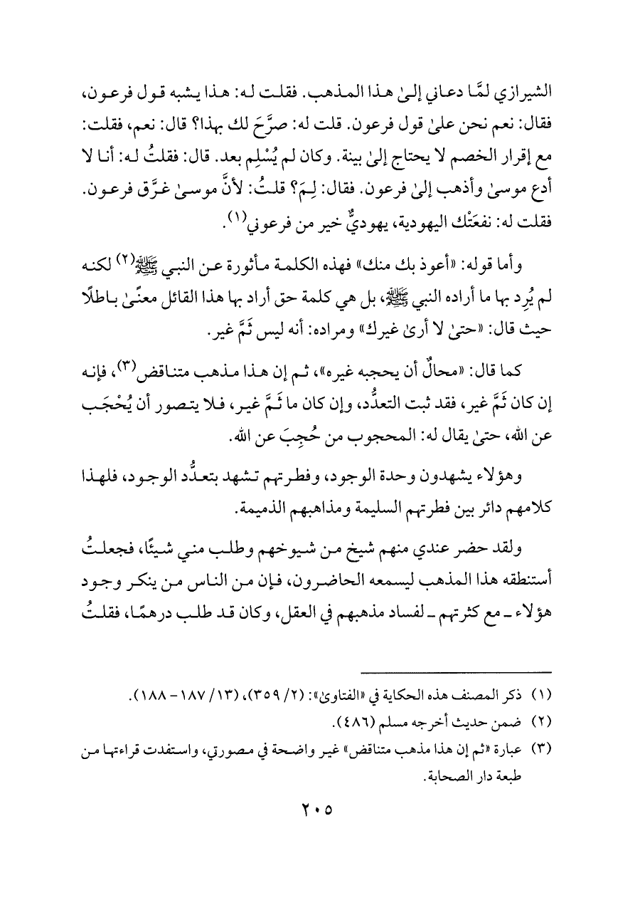 الشيرازي لمَّا دعاني إلى هذا المذهب. فقلت له: هذا يشبه قول فرعون، فقال: نعم نحن على قول فرعون. قلت له: صرَّحَ لك بهذا؟ قال: نعم، فقلت: مع إقرار الخصم لا يحتاج إلى بينة. وكان لم يُسْلِم بعد. قال: فقلتُ له: أنا لا أدع موسى وأذهب إلى فرعون. فقال: لِمَ؟ قلتُ: لأنَّ موسى غرَّق فرعون. فقلت له: نفعَتْك اليهودية، يهوديٌّ خير من فرعوني (¬١).