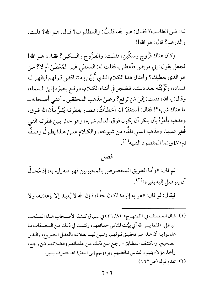 وكان هناك فرُّوج وسكِّين، فقلت: والفرُّوج والسكين؟ فقال: هو الله! فجعل يقول: إني مريض فأعطني، فقلت له: المعطي غير المُعْطَى أم لا؟ من هو الذي يعطيك؟ وأمثال هذا الكلام الذي أُبيِّن به تناقض قولهم ليظهر له فساده، وتَوَّبْتُه بعد ذلك، فضجر في أثناء الكلام، ورفع بصرَه إلى السماء، وقال: يا الله، فقلت: إلى مَن ترفع؟ وعلى مذهب المحققين ــ أعني أصحابه ــ ما هناك شيء؟! فقال: أستغفرُ الله أخطأتُ، فصار بفطرته يُقرُّ بأن الله فوق، ومذهبه يأمرُهُ بأن ينكر أن يكون فوق العالم شيء، وهو حائر بين فطرته التي فُطِر عليها، ومذهبه الذي تلقَّاه من شيوخه. والكلام على هذا يطولُ وصفُه [م ٧١] وإنما المقصود التنبيه (¬١).