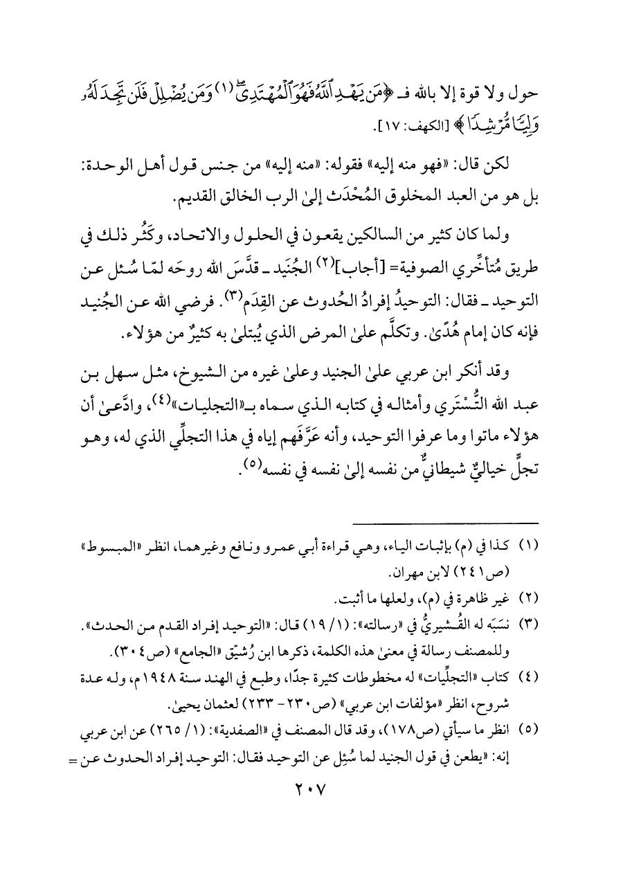 (¬٥) انظر ما سيأتي (ص ١٧٨)، وقد قال المصنف في «الصفدية»: (١/ ٢٦٥) عن ابن عربي إنه: «يطعن في قول الجنيد لما سُئِل عن التوحيد فقال: التوحيد إفراد الحدوث عن القدم. ويقول: لا يميز بين المحدث والقديم إلا مَن كان ليس واحدًا منهما. ذكر هذا وأشباهه في كتابه «التجليات»، وله كتاب «الإسراء» الذي سماه «الإسرا إلى المقام الأسرى»، وجعل له إسراء كإسراء النبي - صلى الله عليه وسلم -. وحاصل إسرائه ... من نوع الكشف العلمي ... وهو كله في نفسه وخيالِه، منه المتكلم ومنه المجيب. وباب الخيال باب لا يحيط به إلا الله، وابن عربي يدعي أن الخيال هو عالم الحقيقة ويعظمه تعظيمًا بليغًا، فجعل في خياله يتكلم على المشايخ وتوحيدهم بكلام يقدح في توحيدهم، ويدَّعي أنه علّمَهم التوحيد في ذلك الإسراء. وهذا كله من جنس قرآن مسليمة بل شر منه، وهو كلام مخلوق اختلقه في نفسه» اهـ بتصرف. وانظر «مؤلفات ابن عربي» (ص ١٧٨).