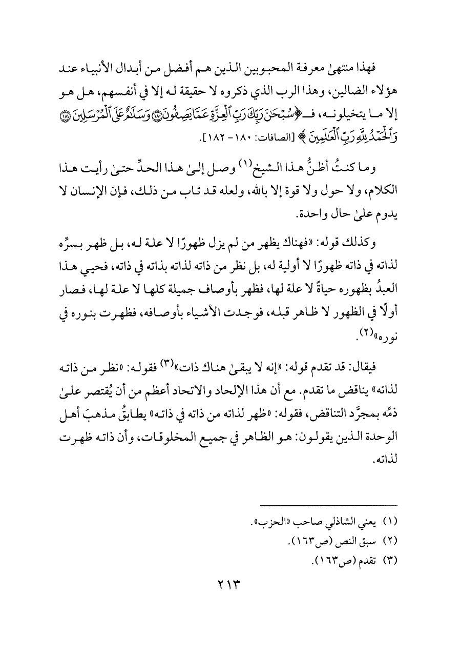 فهذا منتهى معرفة المحبوبين الذين هم أفضل من أبدال الأنبياء عند هؤلاء الضالين، وهذا الرب الذي ذكروه لا حقيقة له إلا في أنفسهم، هل هو إلا ما يتخيلونه، فـ {سُبْحَانَ رَبِّكَ رَبِّ الْعِزَّةِ عَمَّا يَصِفُونَ (١٨٠) وَسَلَامٌ عَلَى الْمُرْسَلِينَ (١٨١) وَالْحَمْدُ لِلَّهِ رَبِّ الْعَالَمِينَ} [الصافات: ١٨٠ - ١٨٢].