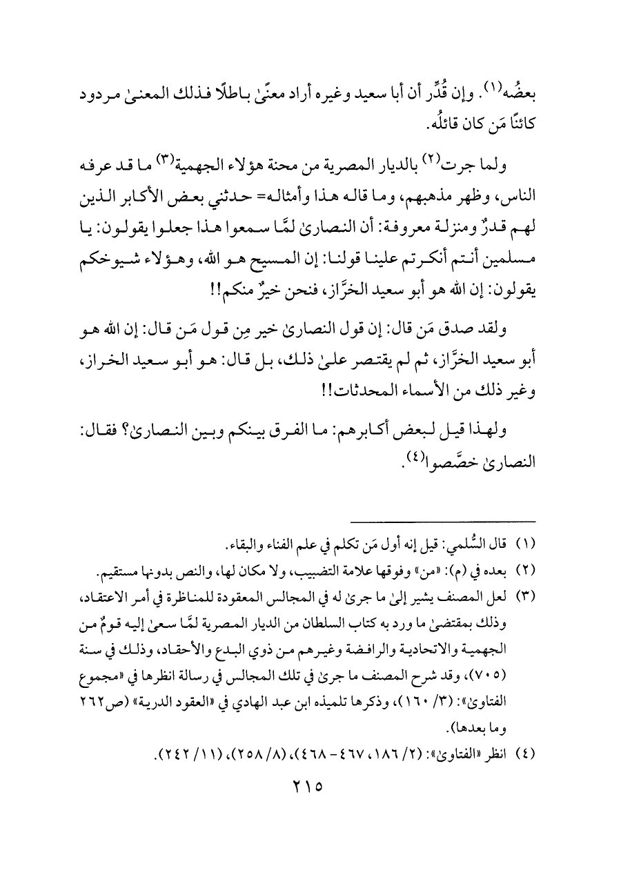 ولما جرت (¬٢) بالديار المصرية من محنة هؤلاء الجهمية (¬٣) ما قد عرفه الناس، وظهر مذهبهم، وما قاله هذا وأمثاله= حدثني بعض الأكابر الذين لهم قدرٌ ومنزلة معروفة: أن النصارى لمَّا سمعوا هذا جعلوا يقولون: يا مسلمين أنتم أنكرتم علينا قولنا: إن المسيح هو الله، وهؤلاء شيوخكم يقولون: إن الله هو أبو سعيد الخرَّاز، فنحن خيرٌ منكم! !