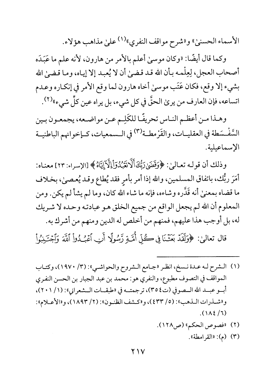 الأسماء الحسنى» و «شرح مواقف النفري» (¬١) على مذاهب هؤلاء.