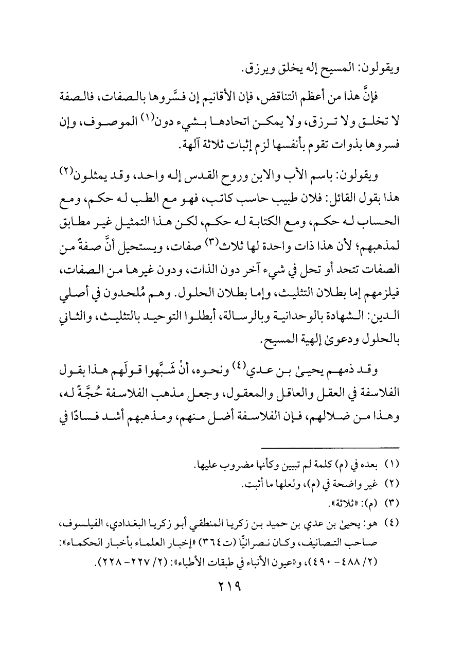 (¬٤) هو: يحيى بن عدي بن حميد بن زكريا المنطقي أبو زكريا البغدادي، الفيلسوف، صاحب التصانيف، وكان نصرانيًّا (ت ٣٦٤) «إخبار العلماء بأخبار الحكماء»: (٢/ ٤٨٨ - ٤٩٠)، و «عيون الأنباء في طبقات الأطباء»: (٢/ ٢٢٧ - ٢٢٨).