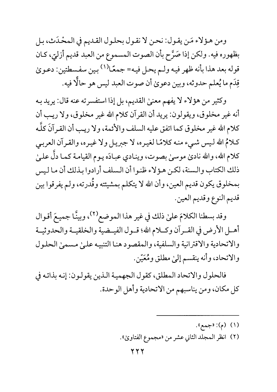ومن هؤلاء مَن يقول: نحن لا نقول بحلول القديم في المحْدَث، بل بظهوره فيه. ولكن إذا صَرَّح بأن الصوت المسموع من العبد قديم أزليّ، كان قوله بعد هذا بأنه ظهر فيه ولم يحل فيه= جمعًا (¬١) بين سفسطتين: دعوى قِدَم ما يُعلم حدوثه، وبين دعوى أن صوت العبد ليس هو حالًّا فيه.