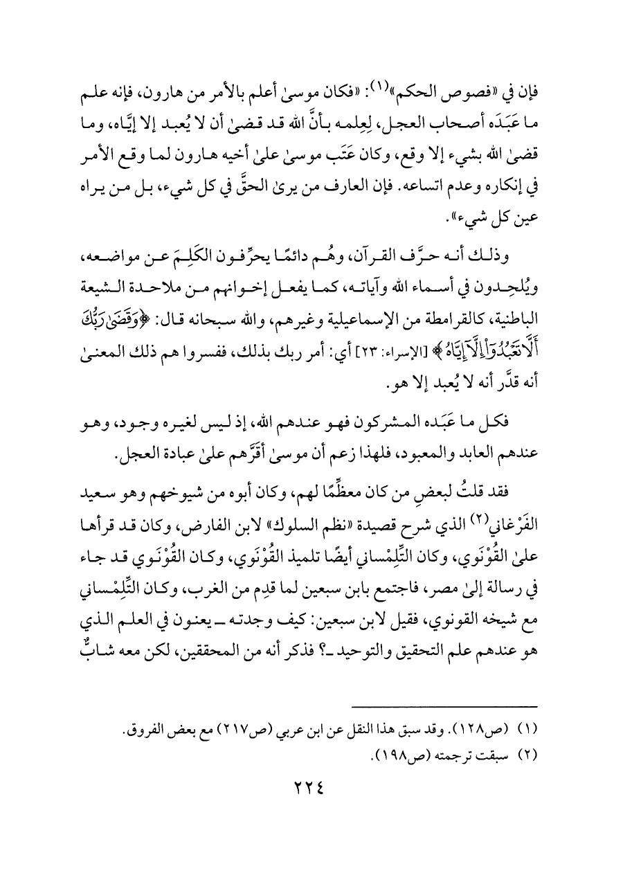 فإن في «فصوص الحكم» (¬١): «فكان موسى أعلم بالأمر من هارون، فإنه علم ما عَبَدَه أصحاب العجل، لِعِلمه بأنَّ الله قد قضى أن لا يُعبد إلا إيَّاه، وما قضى الله بشيء إلا وقع، وكان عَتَب موسى على أخيه هارون لما وقع الأمر في إنكاره وعدم اتساعه. فإن العارف من يرى الحقَّ في كل شيء، بل من يراه عين كل شيء».