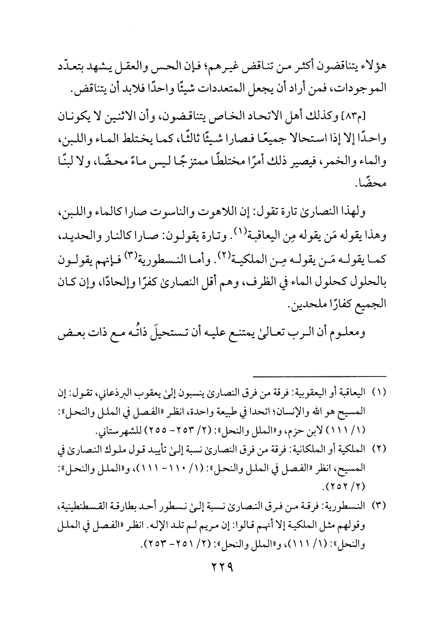 (¬٣) النسطورية: فرقة من فرق النصارى نسبة إلى نسطور أحد بطارقة القسطنطينية، وقولهم مثل الملكية إلا أنهم قالوا: إن مريم لم تلد الإله. انظر «الفصل في الملل والنحل»: (١/ ١١١)، و «الملل والنحل»: (٢/ ٢٥١ - ٢٥٣).
