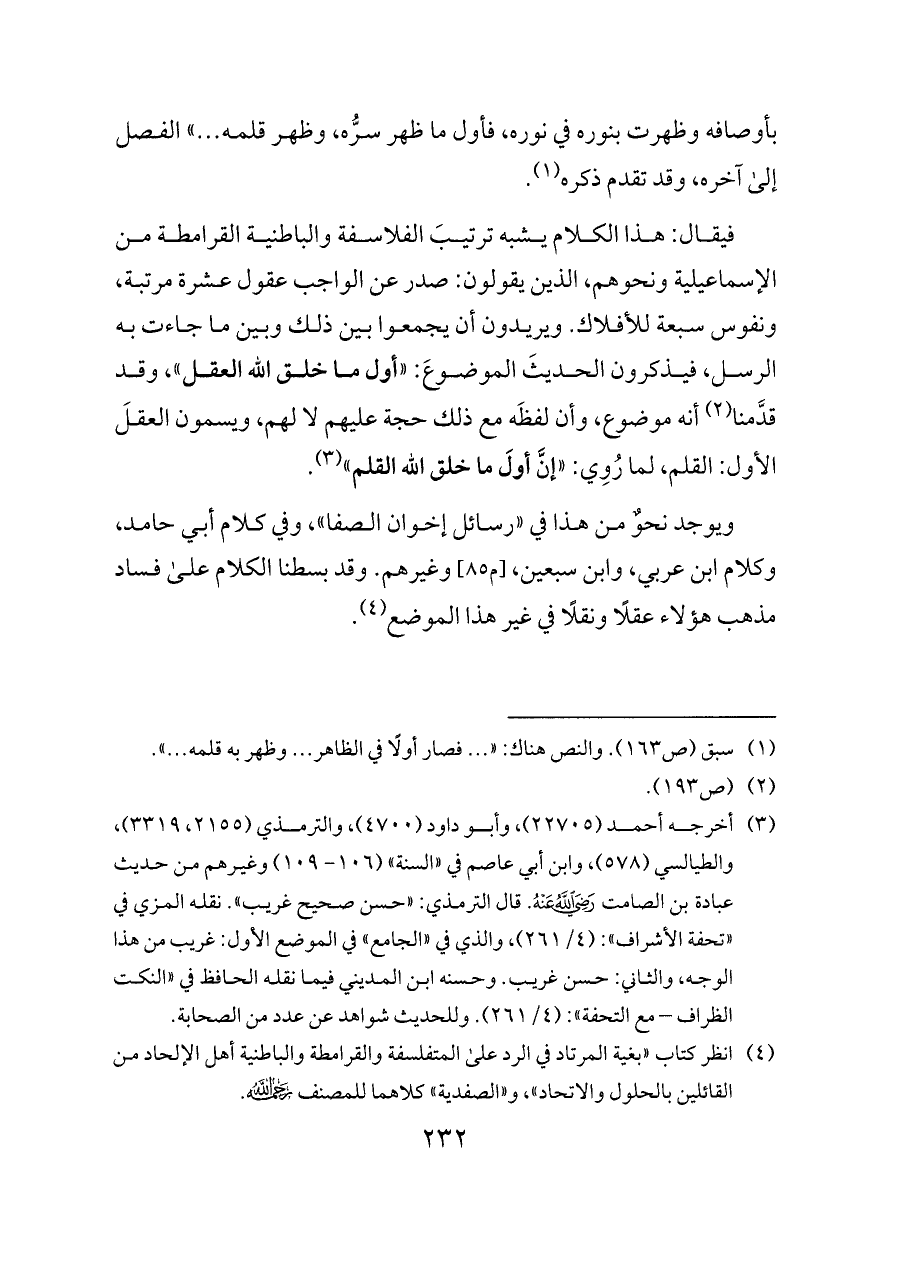 فيقال: هذا الكلام يشبه ترتيبَ الفلاسفة والباطنية القرامطة من الإسماعيلية ونحوهم، الذين يقولون: صدر عن الواجب عقول عشرة مرتبة، ونفوس سبعة للأفلاك. ويريدون أن يجمعوا بين ذلك وبين ما جاءت به الرسل، فيذكرون الحديثَ الموضوعَ: «أول ما خلق الله العقل»، وقد قدَّمنا (¬٢) أنه موضوع، وأن لفظَه مع ذلك حجة عليهم لا لهم، ويسمون العقلَ الأول: القلم، لما رُوِي: «إنَّ أولَ ما خلق الله القلم» (¬٣).