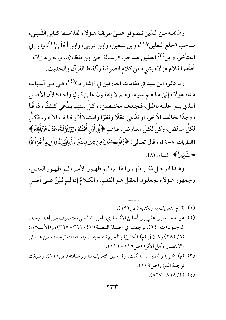 وما ذكره ابن سينا في مقامات العارفين في «إشاراته» (¬٤)، هي من أسباب دعاء هؤلاء إلى ما هم عليه. وهم لا يتفقون على قولٍ واحد؛ لأن الأصل الذي بنوا عليه باطل، فتجدهم مختلفين، وكلٌّ منهم يدَّعي كشفًا وذوقًا ووجدًا يخالف الآخر، أو يَدَّعي عقلًا ونظرًا واستدلالًا يخالف الآخر، فكلٌّ لكلٍّ مناقض، وكلٌّ لكلٍّ معارض، فإنهم {لَفِي قَوْلٍ مُخْتَلِفٍ (٨) يُؤْفَكُ عَنْهُ مَنْ أُفِكَ} [الذاريات: ٨ - ٩]، وقال تعالى: {وَلَوْ كَانَ مِنْ عِنْدِ غَيْرِ اللَّهِ لَوَجَدُوا فِيهِ اخْتِلَافًا كَثِيرًا} [النساء: ٨٢].