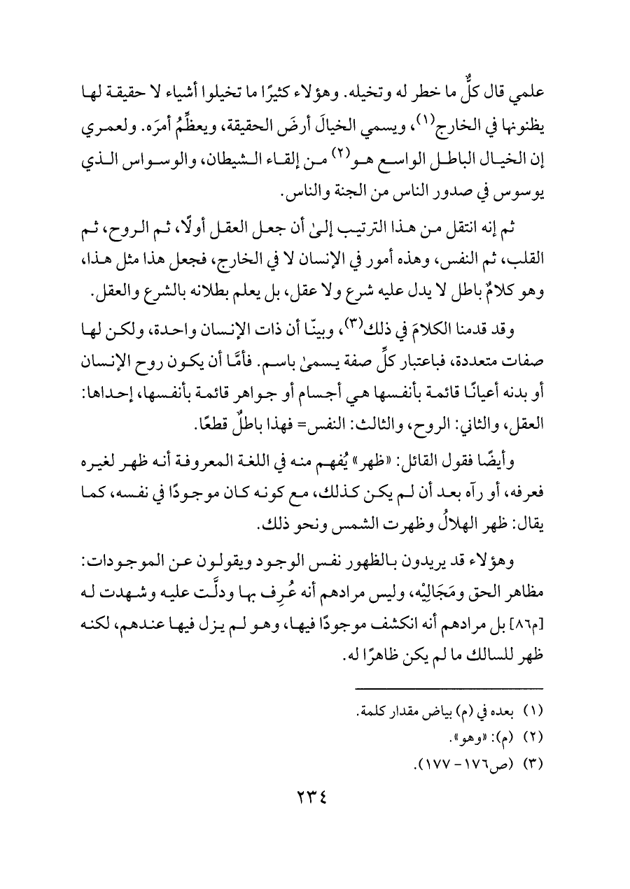علمي قال كلٌّ ما خطر له وتخيله. وهؤلاء كثيرًا ما تخيلوا أشياء لا حقيقة لها يظنونها في الخارج (¬١)، ويسمي الخيالَ أرضَ الحقيقة، ويعظِّمُ أمرَه. ولعمري إن الخيال الباطل الواسع هو (¬٢) من إلقاء الشيطان، والوسواس الذي يوسوس في صدور الناس من الجنة والناس.