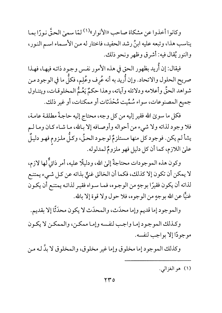 وكانوا أخذوا عن مشكاة صاحب «الأنوار» (¬١) لمّا سمى الحقَّ نورًا بما يناسب هذا، وتبعه عليه ابنُ رشد الحفيد، فاختار له من الأسماء اسم النور، والنور يُقال فيه: أشرق وظهر ونحو ذلك.