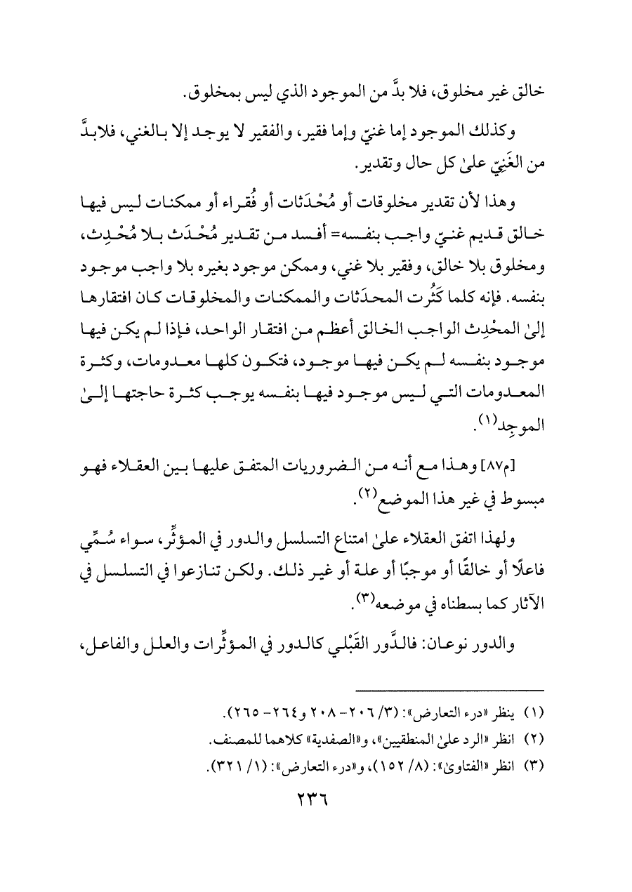 وهذا لأن تقدير مخلوقات أو مُحْدَثات أو فُقراء أو ممكنات ليس فيها خالق قديم غنيّ واجب بنفسه= أفسد من تقدير مُحْدَث بلا مُحْدِث، ومخلوق بلا خالق، وفقير بلا غني، وممكن موجود بغيره بلا واجب موجود بنفسه. فإنه كلما كَثُرت المحدَثات والممكنات والمخلوقات كان افتقارها إلى المحْدِث الواجب الخالق أعظم من افتقار الواحد، فإذا لم يكن فيها موجود بنفسه لم يكن فيها موجود، فتكون كلها معدومات، وكثرة المعدومات التي ليس موجود فيها بنفسه يوجب كثرة حاجتها إلى الموجِد (¬١).