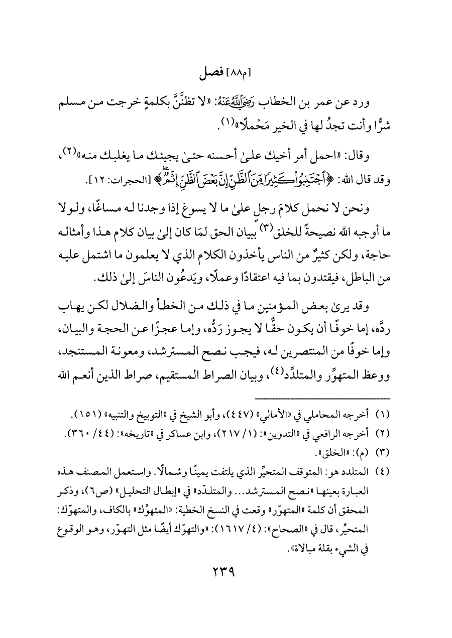 وقد يرى بعض المؤمنين ما في ذلك من الخطأ والضلال لكن يهاب ردَّه، إما خوفًا أن يكون حقًّا لا يجوز رَدُّه، وإما عجزًا عن الحجة والبيان، وإما خوفًا من المنتصرين له، فيجب نصح المسترشد، ومعونة المستنجد، ووعظ المتهوِّر والمتلدِّد (¬٤)، وبيان الصراط المستقيم، صراط الذين أنعم الله