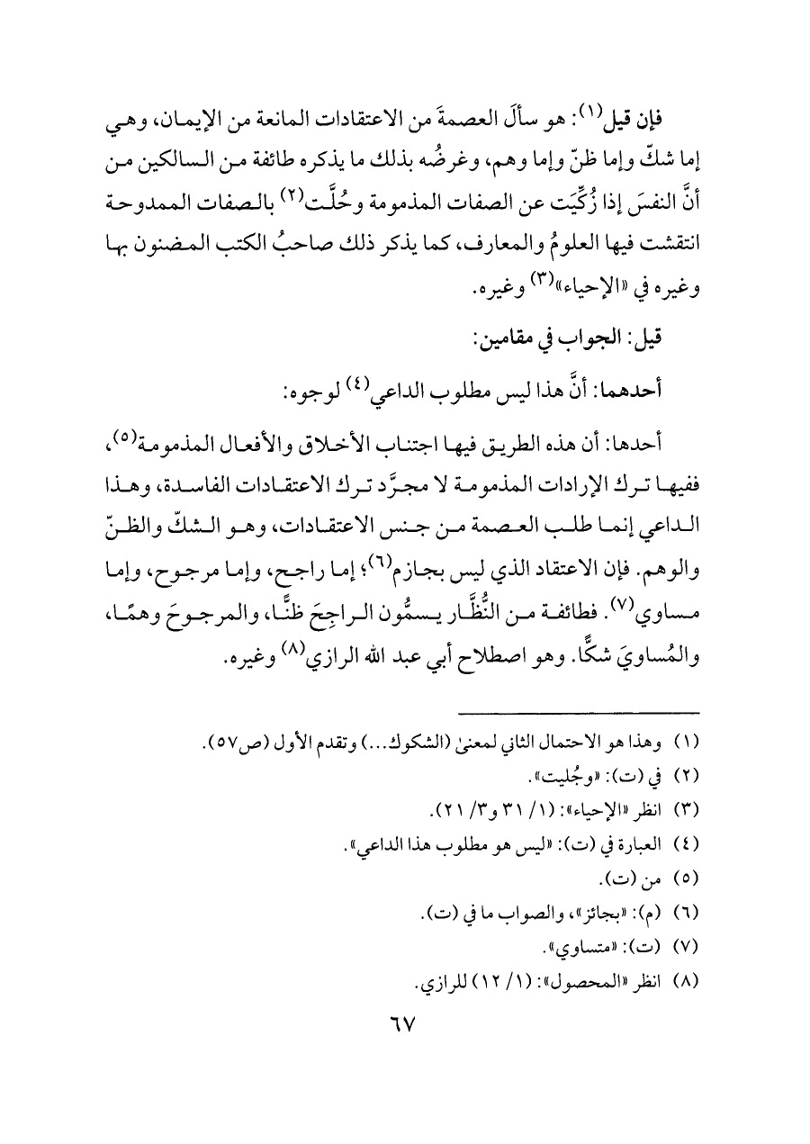 أحدها: أن هذه الطريق فيها اجتناب الأخلاق والأفعال المذمومة (¬٥)، ففيها ترك الإرادات المذمومة لا مجرَّد ترك الاعتقادات الفاسدة، وهذا الداعي إنما طلب العصمة من جنس الاعتقادات، وهو الشكّ والظنّ والوهم. فإن الاعتقاد الذي ليس بجازم (¬٦)؛ إما راجح، وإما مرجوح، وإما مساوي (¬٧). فطائفة من النُّظَّار يسمُّون الراجِحَ ظنًّا، والمرجوحَ وهمًا، والمُساويَ شكًّا. وهو اصطلاح أبي عبد الله الرازي (¬٨) وغيره.