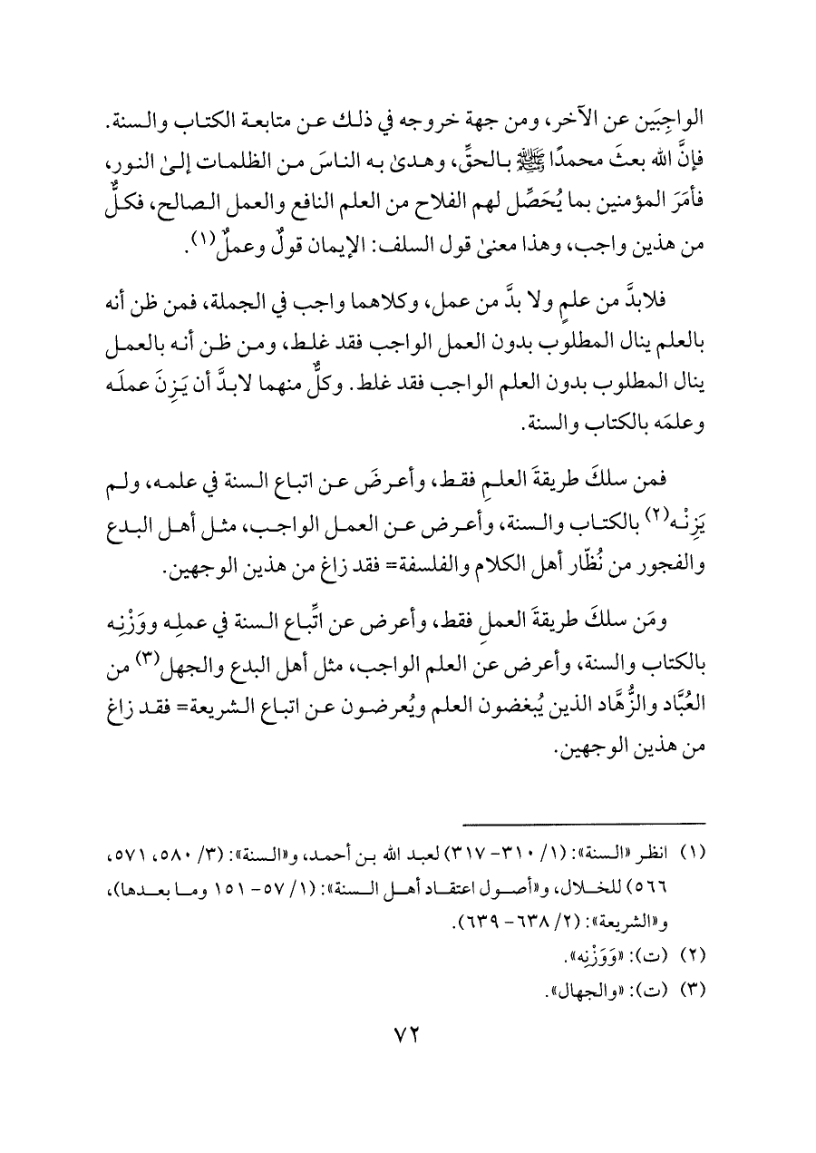 الواجِبَين عن الآخر، ومن جهة خروجه في ذلك عن متابعة الكتاب والسنة. فإنَّ الله بعثَ محمدًا - صلى الله عليه وسلم - بالحقِّ، وهدى به الناسَ من الظلمات إلى النور، فأمَرَ المؤمنين بما يُحَصِّل لهم الفلاح من العلم النافع والعمل الصالح، فكلٌّ من هذين واجب، وهذا معنى قول السلف: الإيمان قولٌ وعملٌ (¬١).