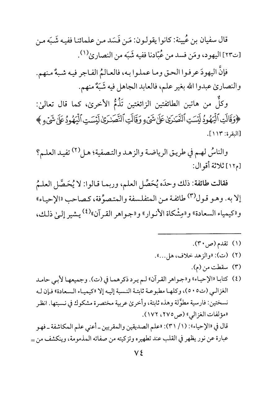 فقالت طائفة: ذلك وحدَه يُحَصِّل العلم، وربما قالوا: لا يُحَصَّل العلمُ إلا به. وهو قول (¬٣) طائفة من المتفلسفة والمتصوِّفة، كصاحب «الإحياء» و «كيمياء السعادة» و «مِشْكاة الأنوار» و «جواهر القرآن» (¬٤)