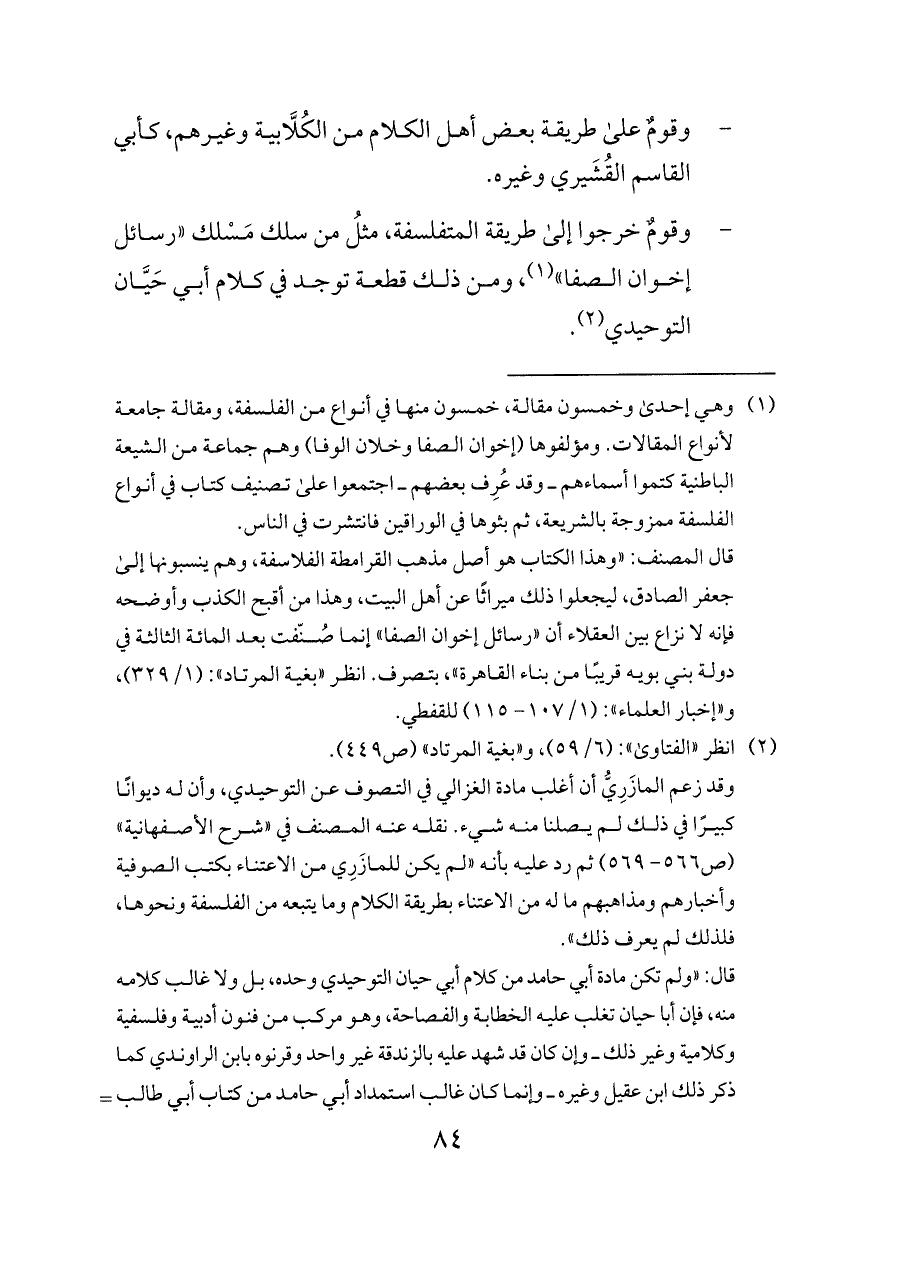 - وقومٌ خرجوا إلى طريقة المتفلسفة، مثلُ من سلك مَسْلك «رسائل إخوان الصفا» (¬١)، ومن ذلك قطعة توجد في كلام أبي حَيَّان التوحيدي (¬٢).