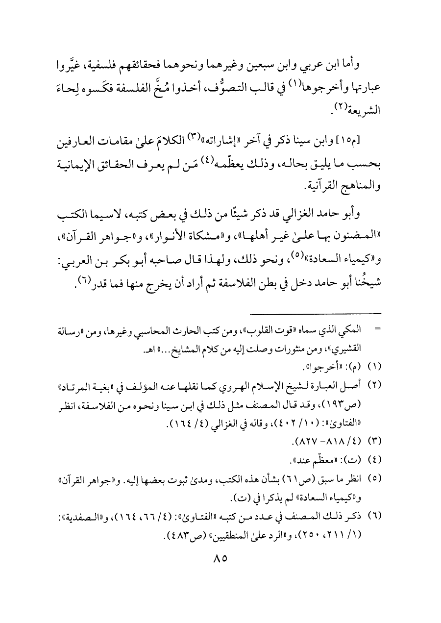 [م ١٥] وابن سينا ذكر في آخر «إشاراته» (¬٣) الكلامَ على مقامات العارفين بحسب ما يليق بحاله، وذلك يعظّمه (¬٤) مَن لم يعرف الحقائق الإيمانية والمناهج القرآنية.