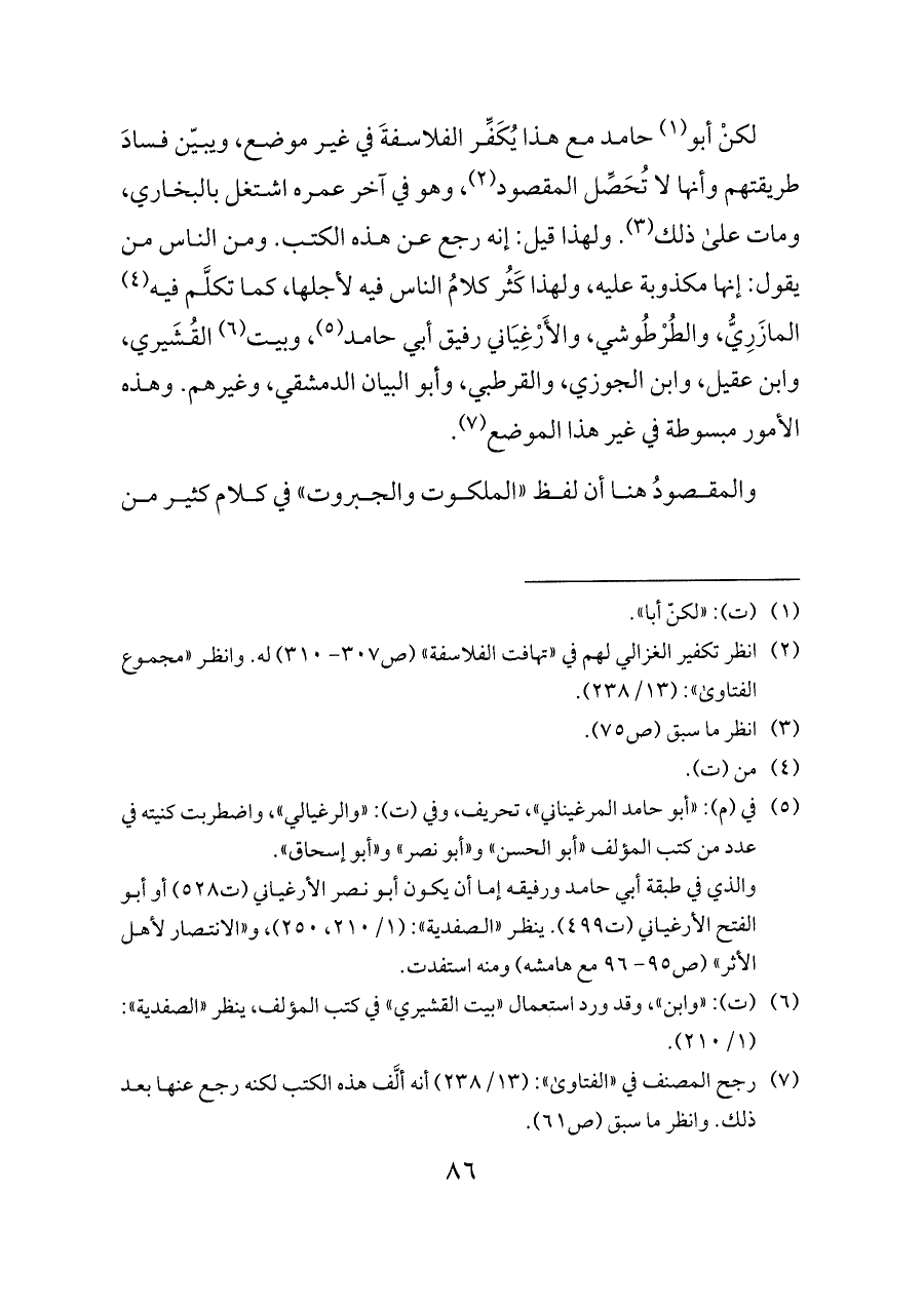 (¬٢) انظر تكفير الغزالي لهم في «تهافت الفلاسفة» (ص ٣٠٧ - ٣١٠) له. وانظر «مجموع الفتاوى»: (١٣/ ٢٣٨).