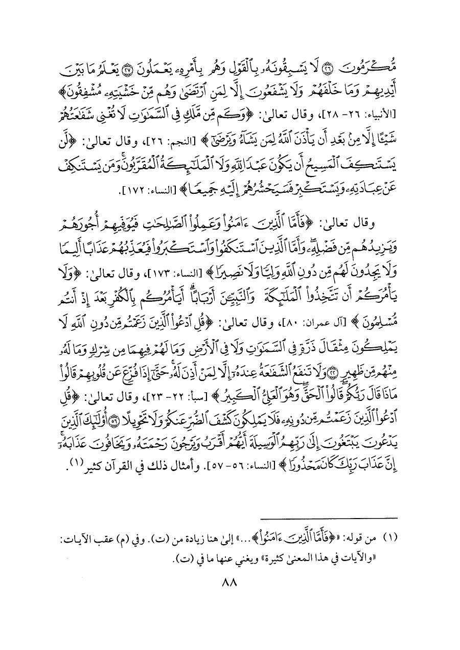 وقال تعالى: {فَأَمَّا الَّذِينَ آمَنُوا وَعَمِلُوا الصَّالِحَاتِ فَيُوَفِّيهِمْ أُجُورَهُمْ وَيَزِيدُهُمْ مِنْ فَضْلِهِ وَأَمَّا الَّذِينَ اسْتَنْكَفُوا وَاسْتَكْبَرُوا فَيُعَذِّبُهُمْ عَذَابًا أَلِيمًا وَلَا يَجِدُونَ لَهُمْ مِنْ دُونِ اللَّهِ وَلِيًّا وَلَا نَصِيرًا} [النساء: ١٧٣]، وقال تعالى: {وَلَا يَأْمُرَكُمْ أَنْ تَتَّخِذُوا الْمَلَائِكَةَ وَالنَّبِيِّينَ أَرْبَابًا أَيَأْمُرُكُمْ بِالْكُفْرِ بَعْدَ إِذْ أَنْتُمْ مُسْلِمُونَ} [آل عمران: ٨٠]، وقال تعالى: {قُلِ ادْعُوا الَّذِينَ زَعَمْتُمْ مِنْ دُونِ اللَّهِ لَا يَمْلِكُونَ مِثْقَالَ ذَرَّةٍ فِي السَّمَاوَاتِ وَلَا فِي الْأَرْضِ وَمَا لَهُمْ فِيهِمَا مِنْ شِرْكٍ وَمَا لَهُ مِنْهُمْ مِنْ ظَهِيرٍ وَلَا تَنْفَعُ الشَّفَاعَةُ عِنْدَهُ إِلَّا لِمَنْ أَذِنَ لَهُ حَتَّى إِذَا فُزِّعَ عَنْ قُلُوبِهِمْ قَالُوا مَاذَا قَالَ رَبُّكُمْ قَالُوا الْحَقَّ وَهُوَ الْعَلِيُّ الْكَبِيرُ} [سبأ: ٢٢ - ٢٣]، وقال تعالى: {قُلِ ادْعُوا الَّذِينَ زَعَمْتُمْ مِنْ دُونِهِ فَلَا يَمْلِكُونَ كَشْفَ الضُّرِّ عَنْكُمْ وَلَا تَحْوِيلًا (٥٦) أُولَئِكَ الَّذِينَ يَدْعُونَ يَبْتَغُونَ إِلَى رَبِّهِمُ الْوَسِيلَةَ أَيُّهُمْ أَقْرَبُ وَيَرْجُونَ رَحْمَتَهُ وَيَخَافُونَ عَذَابَهُ إِنَّ عَذَابَ رَبِّكَ كَانَ مَحْذُورًا} [النساء: ٥٦ - ٥٧]. وأمثال ذلك في القرآن كثير (¬١).