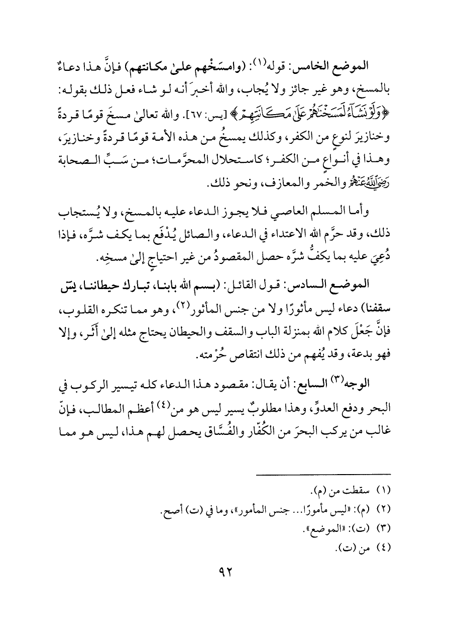 الموضع الخامس: قوله (¬١): (وامسَخْهم على مكانتهم) فإنَّ هذا دعاءٌ بالمسخ، وهو غير جائز ولا يُجاب، والله أخبرَ أنه لو شاء فعل ذلك بقوله: {وَلَوْ نَشَاءُ لَمَسَخْنَاهُمْ عَلَى مَكَانَتِهِمْ} [يس: ٦٧]. والله تعالى مسخَ قومًا قردةً وخنازيرَ لنوعٍ من الكفر، وكذلك يمسخُ من هذه الأمة قومًا قردةً وخنازيرَ، وهذا في أنواعٍ من الكفر؛ كاستحلال المحرَّمات؛ من سَبِّ الصحابة - رضي الله عنهم - والخمر والمعازف، ونحو ذلك.