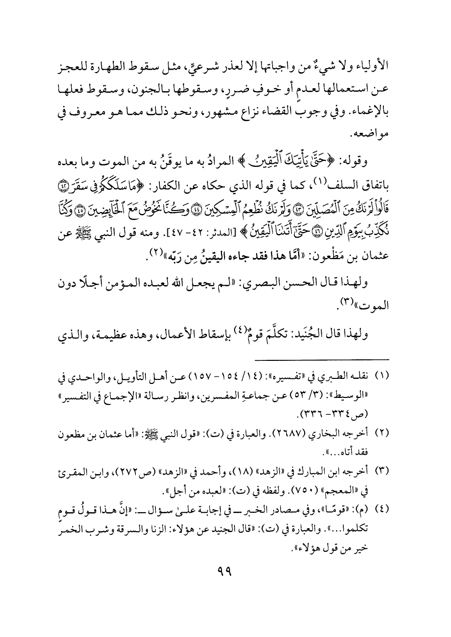 وقوله: {حَتَّى يَأْتِيَكَ الْيَقِينُ} المرادُ به ما يوقَنُ به من الموت وما بعده باتفاق السلف (¬١)، كما في قوله الذي حكاه عن الكفار: {عَنِ الْمُجْرِمِينَ (٤١) مَا سَلَكَكُمْ فِي سَقَرَ (٤٢) قَالُوا لَمْ نَكُ مِنَ الْمُصَلِّينَ (٤٣) وَلَمْ نَكُ نُطْعِمُ الْمِسْكِينَ (٤٤) وَكُنَّا نَخُوضُ مَعَ الْخَائِضِينَ (٤٥) وَكُنَّا نُكَذِّبُ بِيَوْمِ الدِّينِ (٤٦)} [المدثر: ٤٢ - ٤٧]. ومنه قول النبي - صلى الله عليه وسلم - عن عثمان بن مَظْعون: «أمَّا هذا فقد جاءه اليقينُ مِن رَبّه» (¬٢).