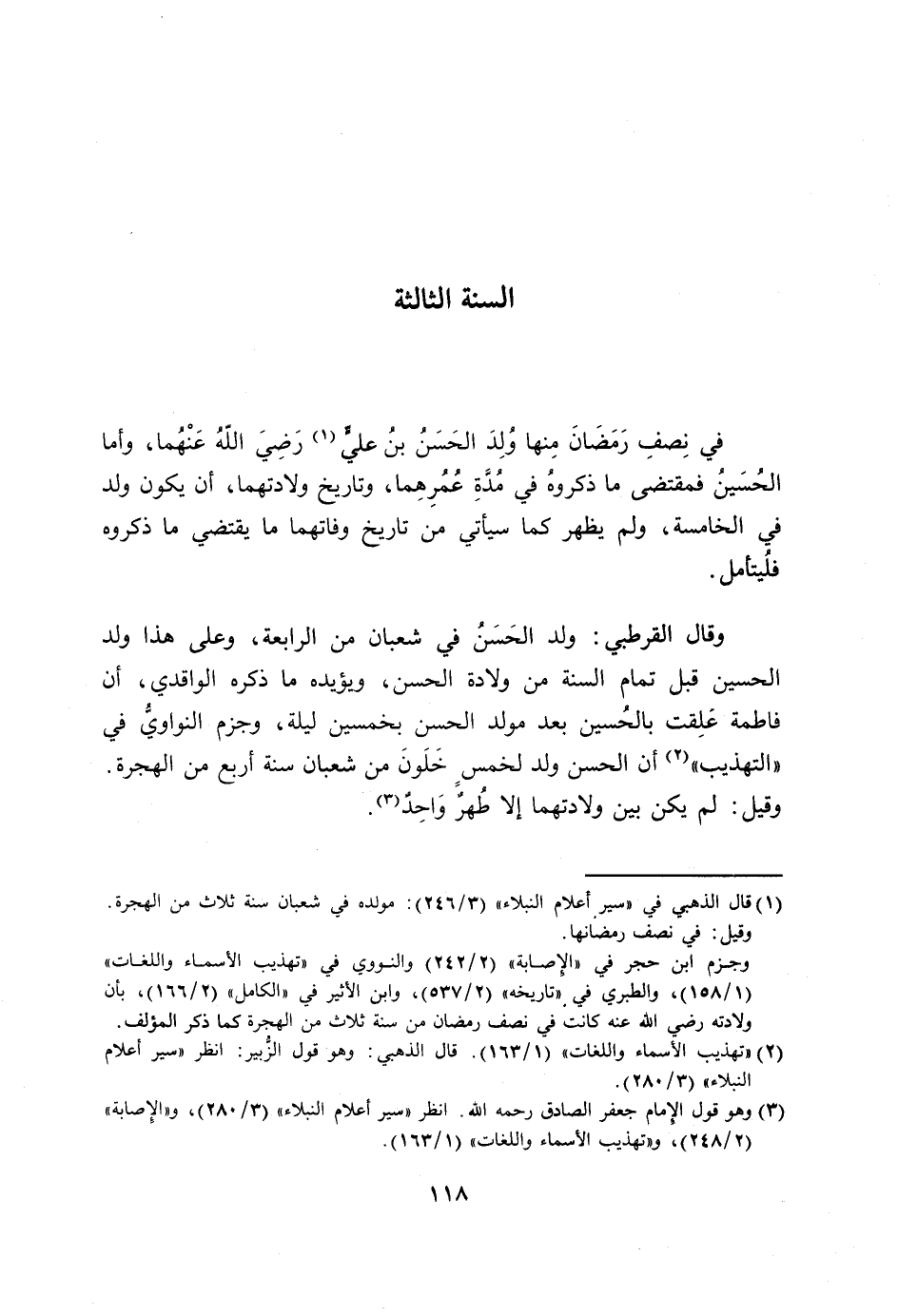 في نصف رمضان منها ولد الحسن بن عليّ [1] رضي الله عنهما، وأما الحسين فمقتضى ما ذكروه في مدّة عمرهما، وتاريخ ولادتهما، أن يكون ولد في الخامسة، ولم يظهر كما سيأتي من تاريخ وفاتهما ما يقتضي ما ذكروه فليتأمل.