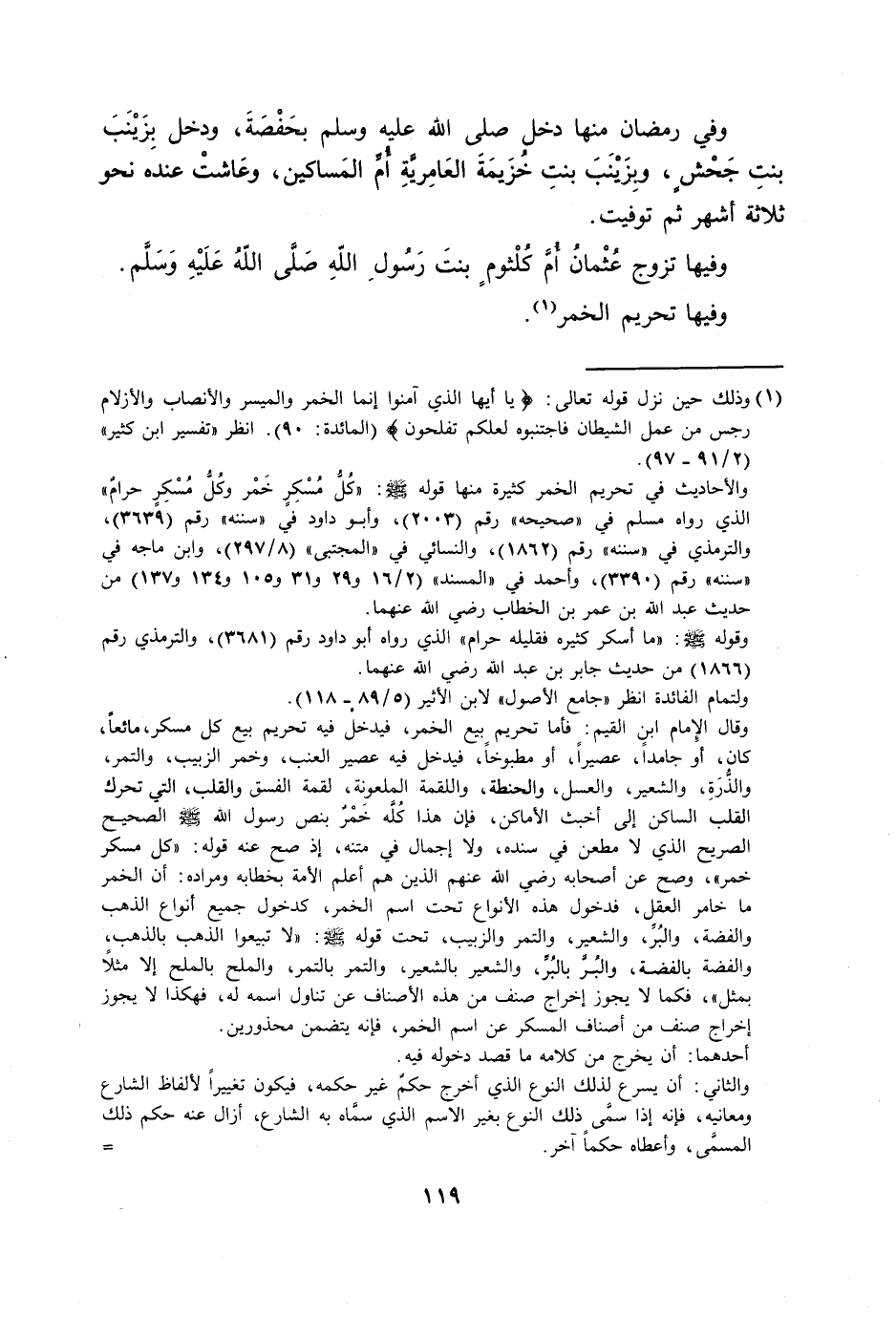 والأحاديث في تحريم الخمر كثيرة منها قوله صلى الله عليه وسلم: «كلّ مسكر خمر وكلّ مسكر حرام» الذي رواه مسلم في «صحيحه» رقم (2003) ، وأبو داود في «سننه» رقم (3639) ، والترمذي في «سننه» رقم (1862) ، والنسائي في «المجتبى» (8/ 297) ، وابن ماجة في «سننه» رقم (3390) ، وأحمد في «المسند» (2/ 16 و 29 و 31 و 105 و 134 و 137) من حديث عبد الله بن عمر بن الخطاب رضي الله عنهما. وقوله صلى الله عليه وسلم: «ما أسكر كثيره فقليله حرام» الذي رواه أبو داود رقم (3681) ، والترمذي رقم (1866) من حديث جابر بن عبد الله رضي الله عنهما. ولتمام الفائدة انظر «جامع الأصول» لابن الأثير (5/ 89- 118) .